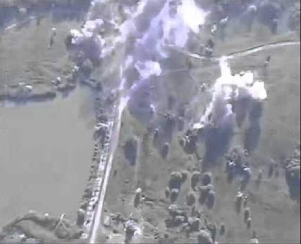 Замаскировавшиеся нацисты были замечены с дрона. После чего по ангару открыли огонь гаубицы.